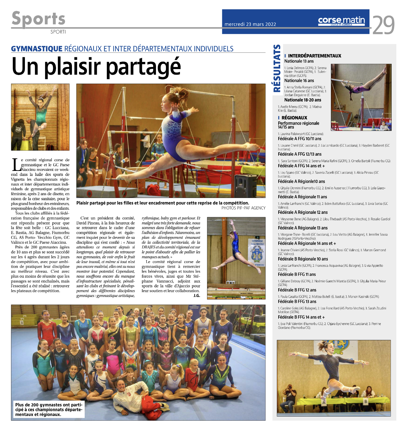 Plusieurs jeunes de la commune se sont illustrés les 19 et 20 mars 2022 à l'occasion du championnat régional individuel de Gymnastique qui a eu lieu à Ajaccio.